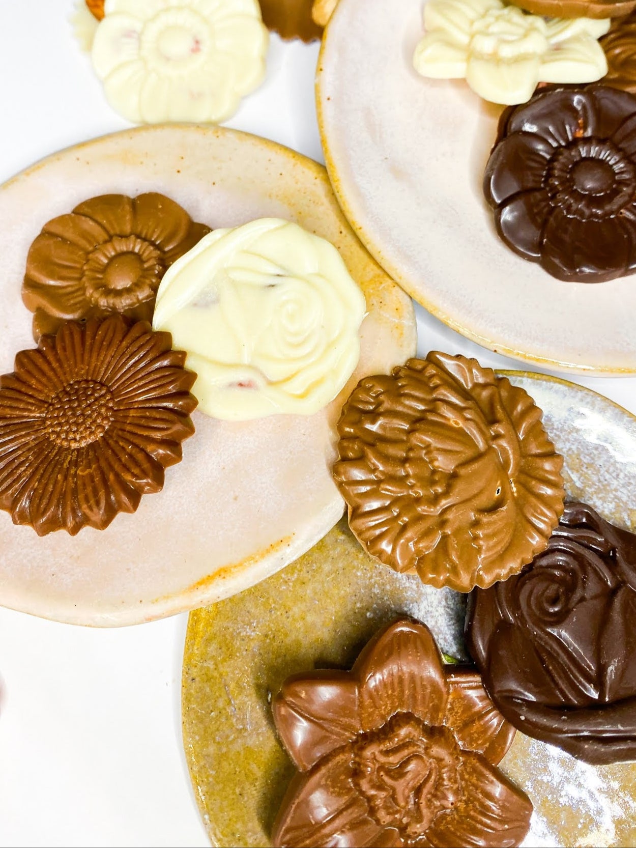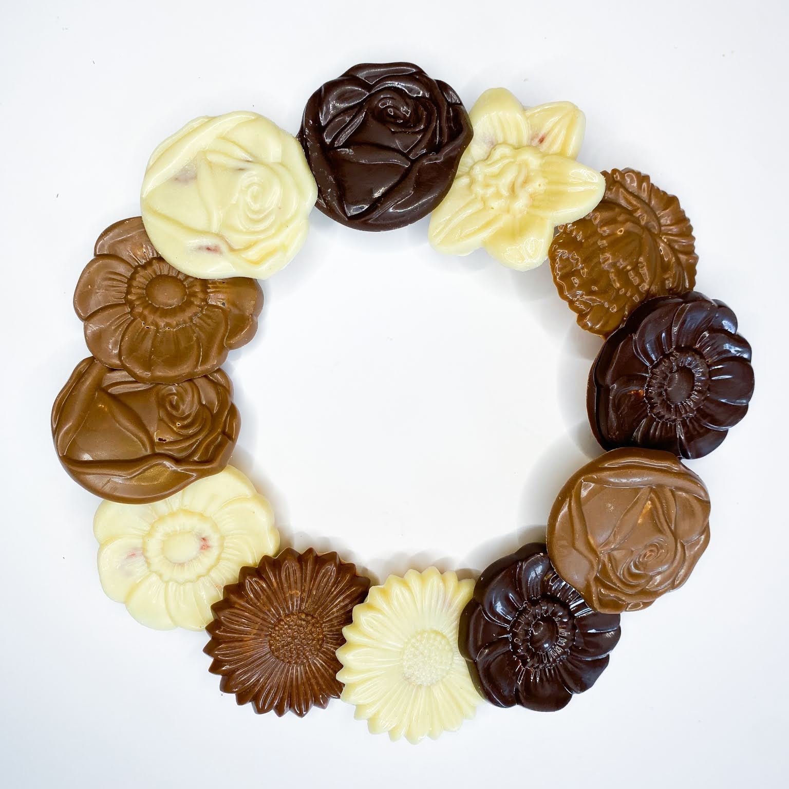 Un assortiment fleuri de cinq chocolats différents : chocolat amande, chocolat noisette, chocolat blanc, chocolat caramel et chocolat noir dominica 60%. Une composition à croquer ou à offrir pour découvrir nos différents chocolats.