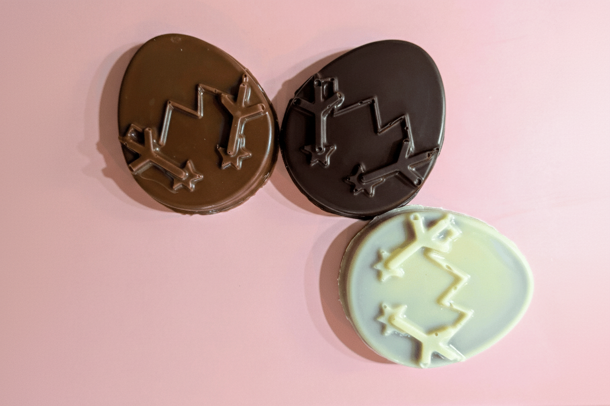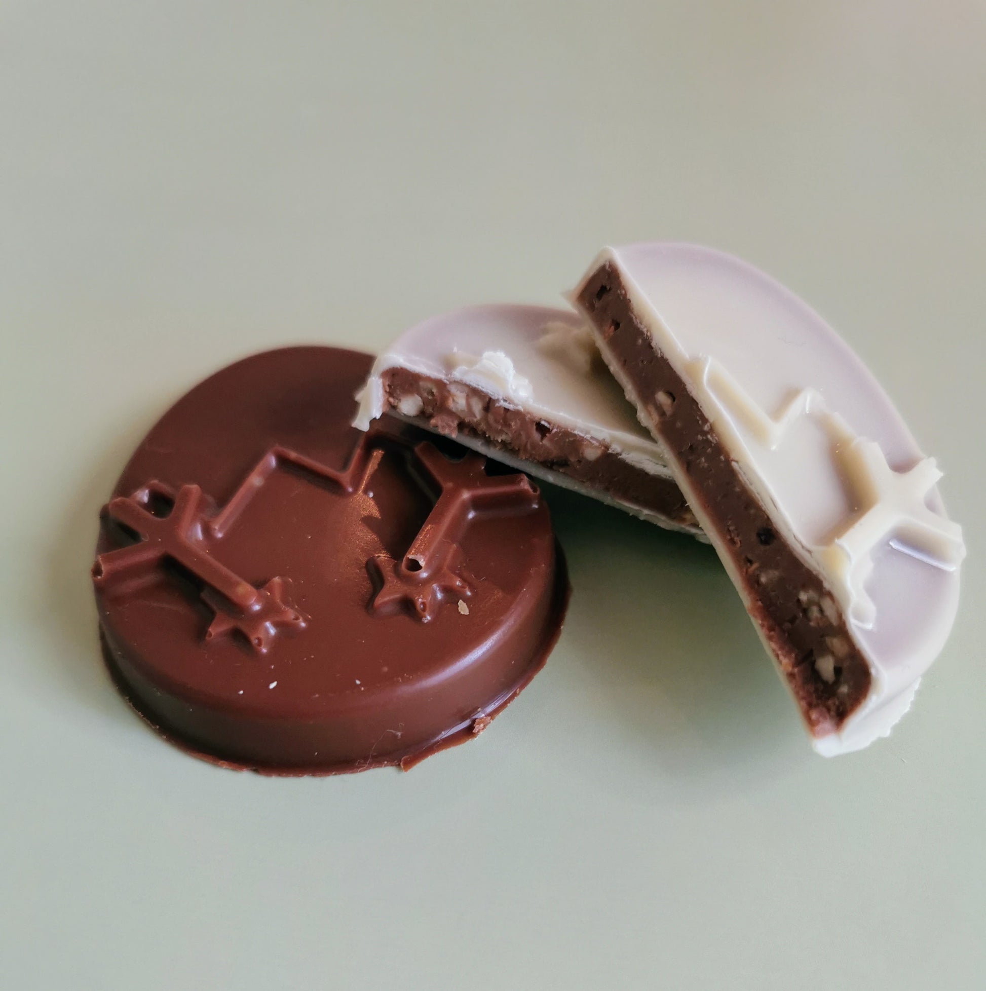 Elle est disponible en coque : Chocolat Amande, chocolat blanc ou chocolat noir 609% Dominica. A l'intérieur se cache un praliné noisette 70 % croustillant, riche en goût et délicatement texturé.