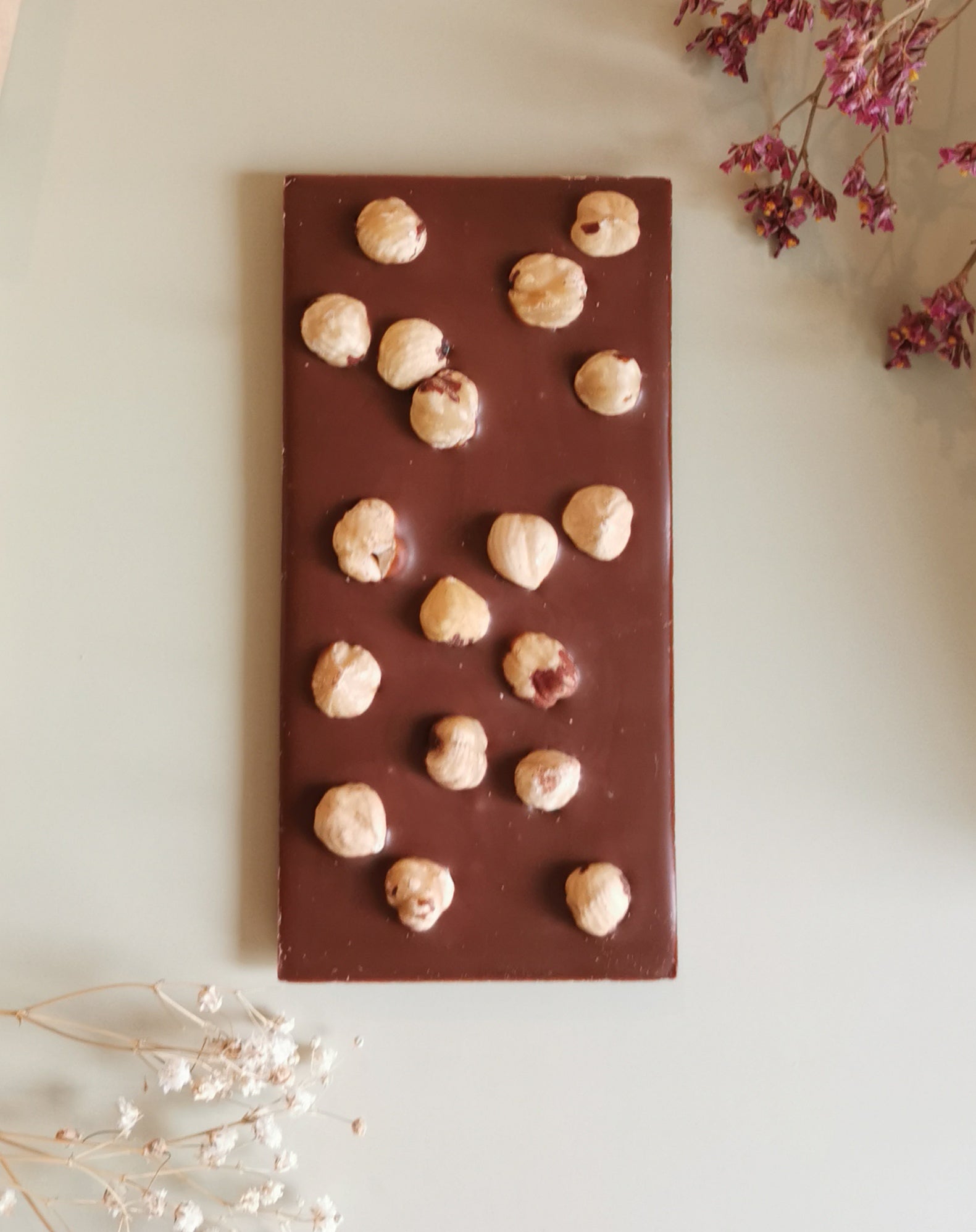 Une tablette de chocolat à l'amande parsemée de noisettes entières pour un croquant inégalé.